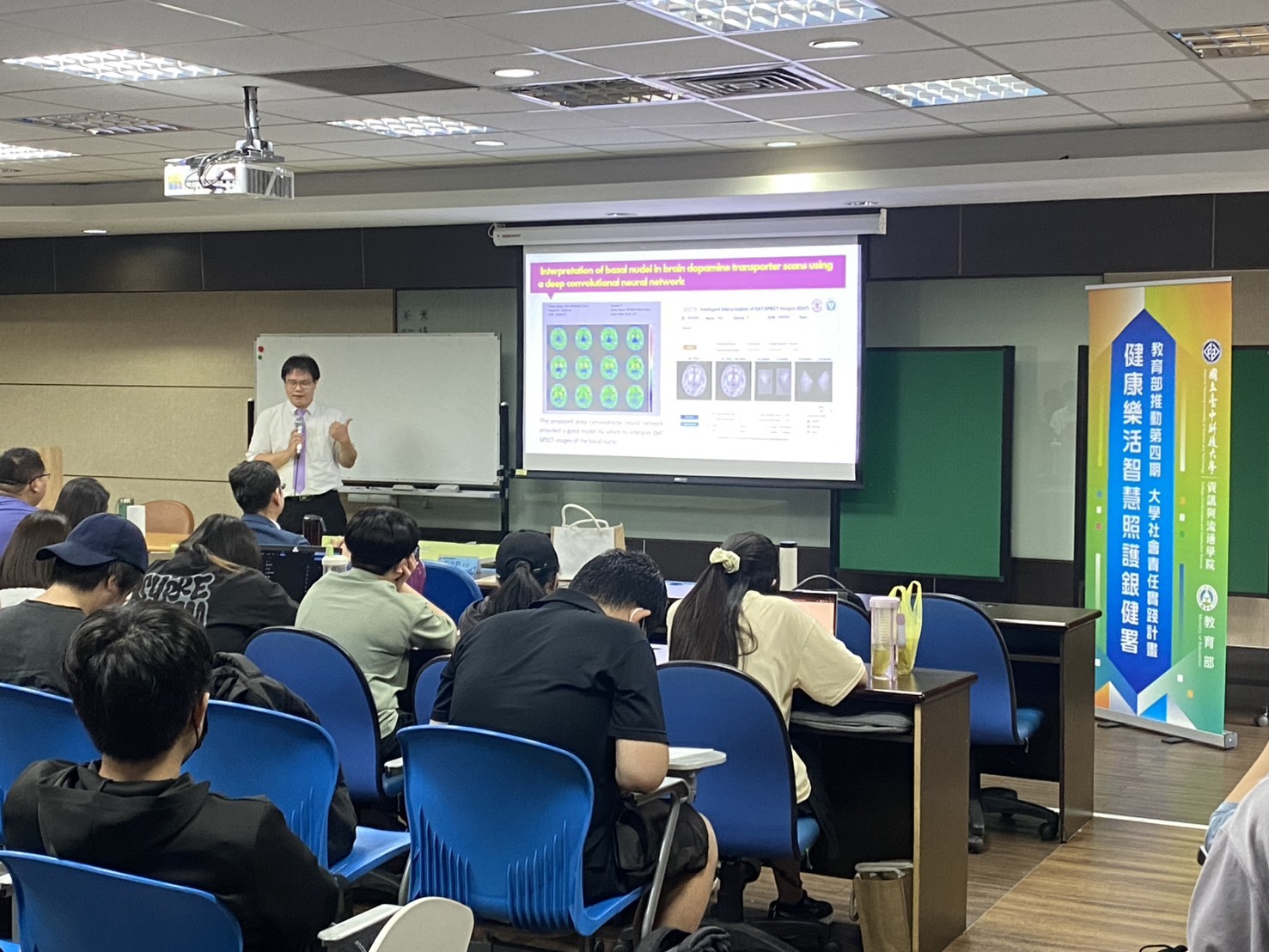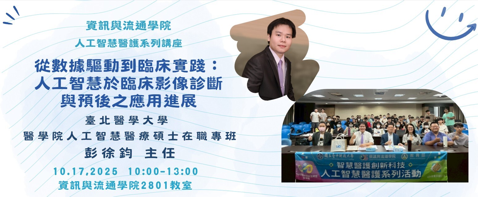 國立臺中科技大學資訊與流通學院(本院)於114年10月17日隆重舉辦專題講座,特別邀請臺北醫學大學醫學院彭徐鈞主任蒞校演講,講題為「從數據驅動到臨床實踐:人工智慧於臨床影像診斷與預後之應用進展」,吸引許多學生到場聆聽。
