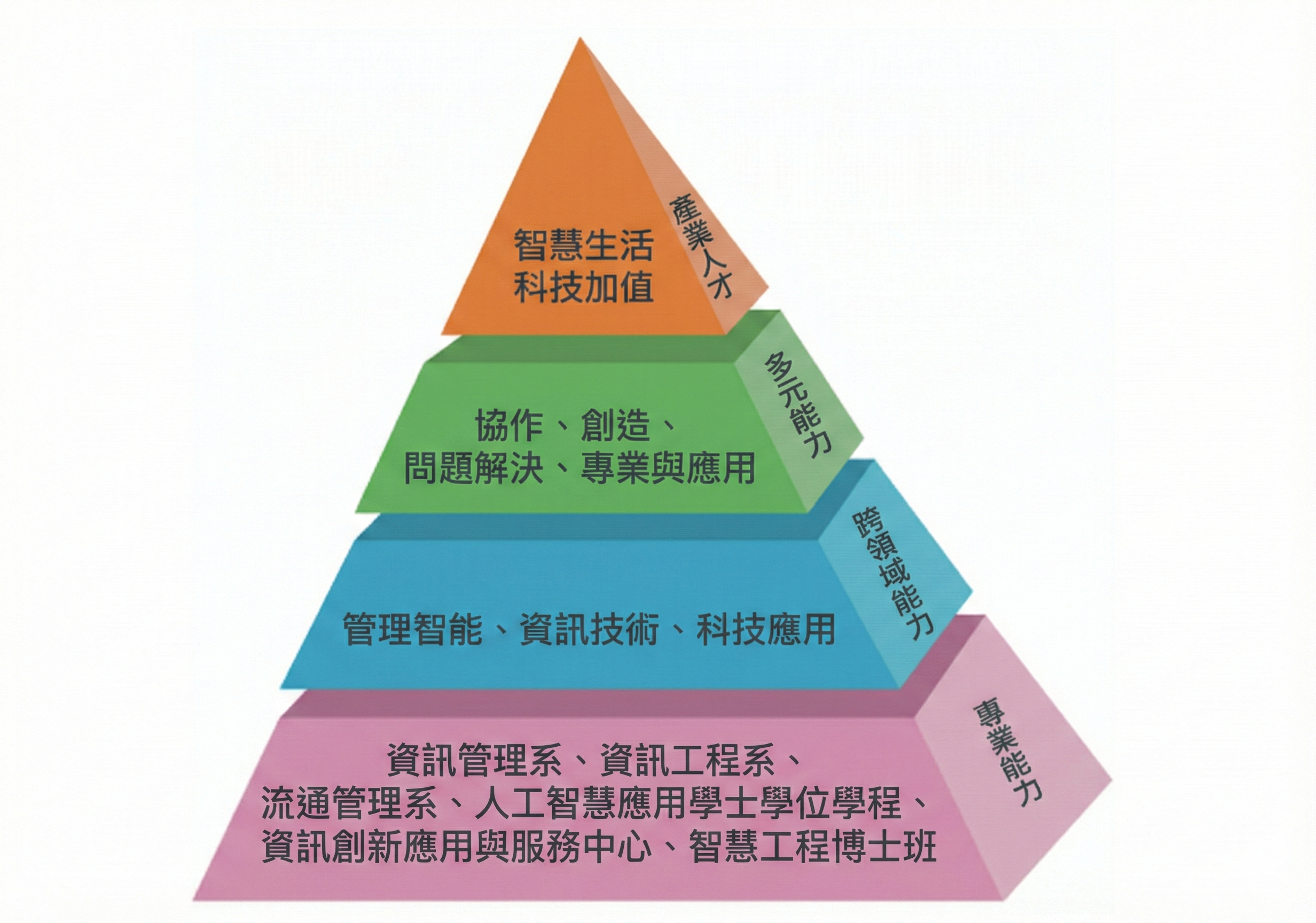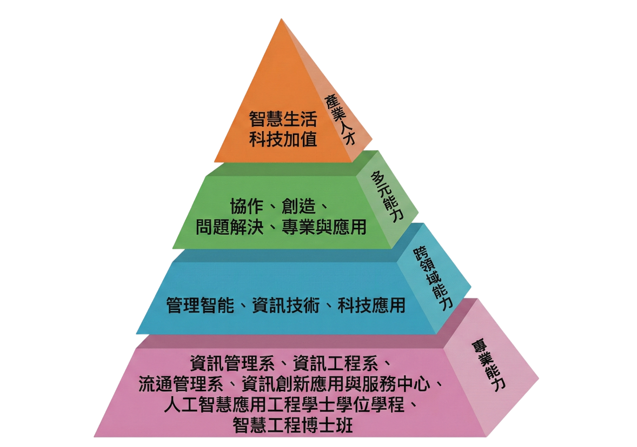 本院統籌資訊管理、資訊工程與流通管理三系、人工智慧應用工程學士學位學程一學位學程、智慧工程博士班與資訊創新與服務中心之教學與研發能量,在各單位專業基礎上強化學生「管理智能」、「資訊技術」與「科技應用」跨領域能力,並輔以「協作」、「創造」、「應變」與「專業與應用」等多元能力開發,以培育具備「智慧生活」與「科技加值」的現代化產業專業人才為目標,如圖1所示。